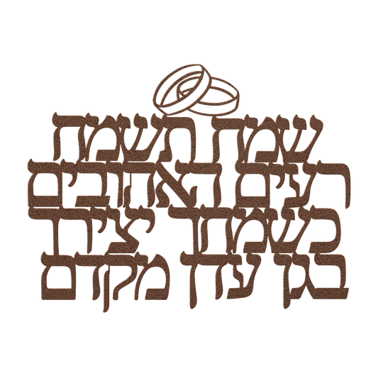 Hebrew metal sign “Gladden the beloved companions as You gladdened Your creation in the Garden of Eden of old” with wedding rings