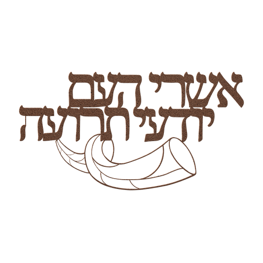 Hebrew metal sign “Blessed are the people who know the teruah” - Ashrei ha’am yodei teruah with a shofar