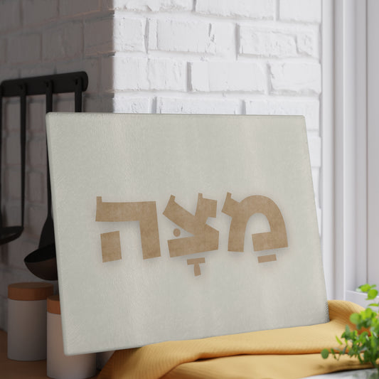 Passover Matzah Glass Board with 'Matzah' Inscription in Hebrew - Beige and Brown Inscription