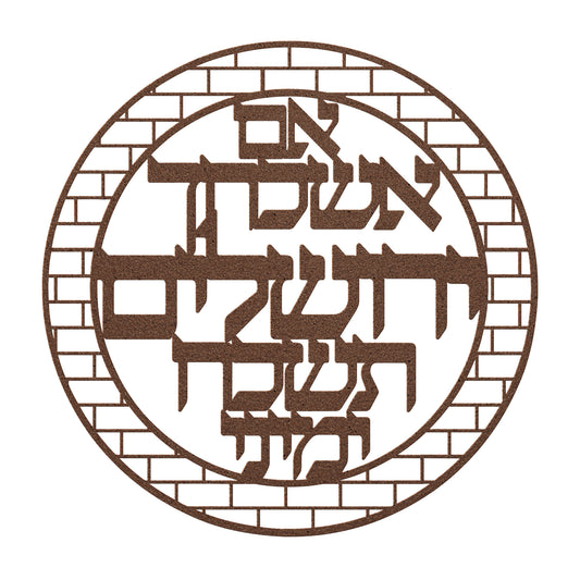 A Hebrew metal sign "If I forget you, O Jerusalem, let my right hand forget its skill" within a circle of walls
