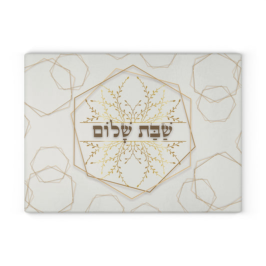 Shabbat Challah Glass Board With Hebrew Shabbat Shalom And Geometric Shapes