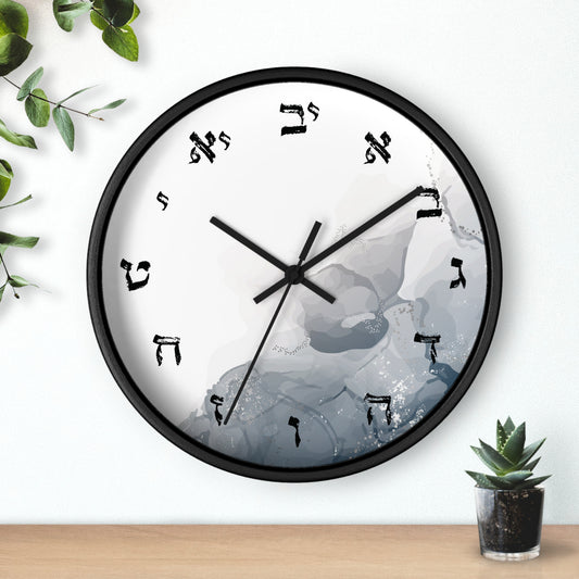 Hebrew letters wall clock with abstract print with shades of gray
