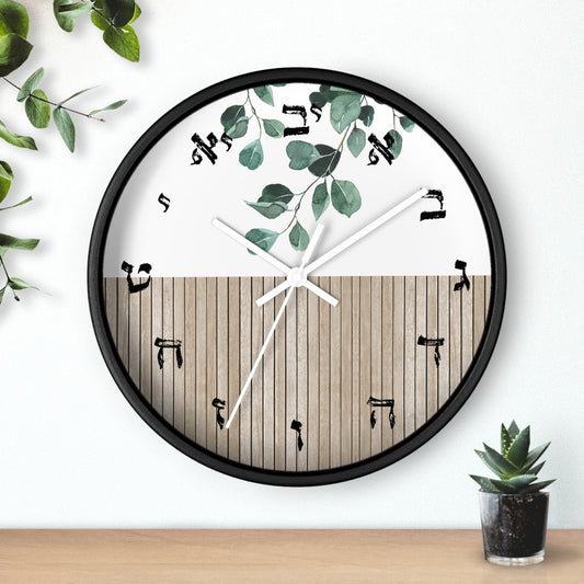 Hebrew letters wall clock with wood and leaves print
