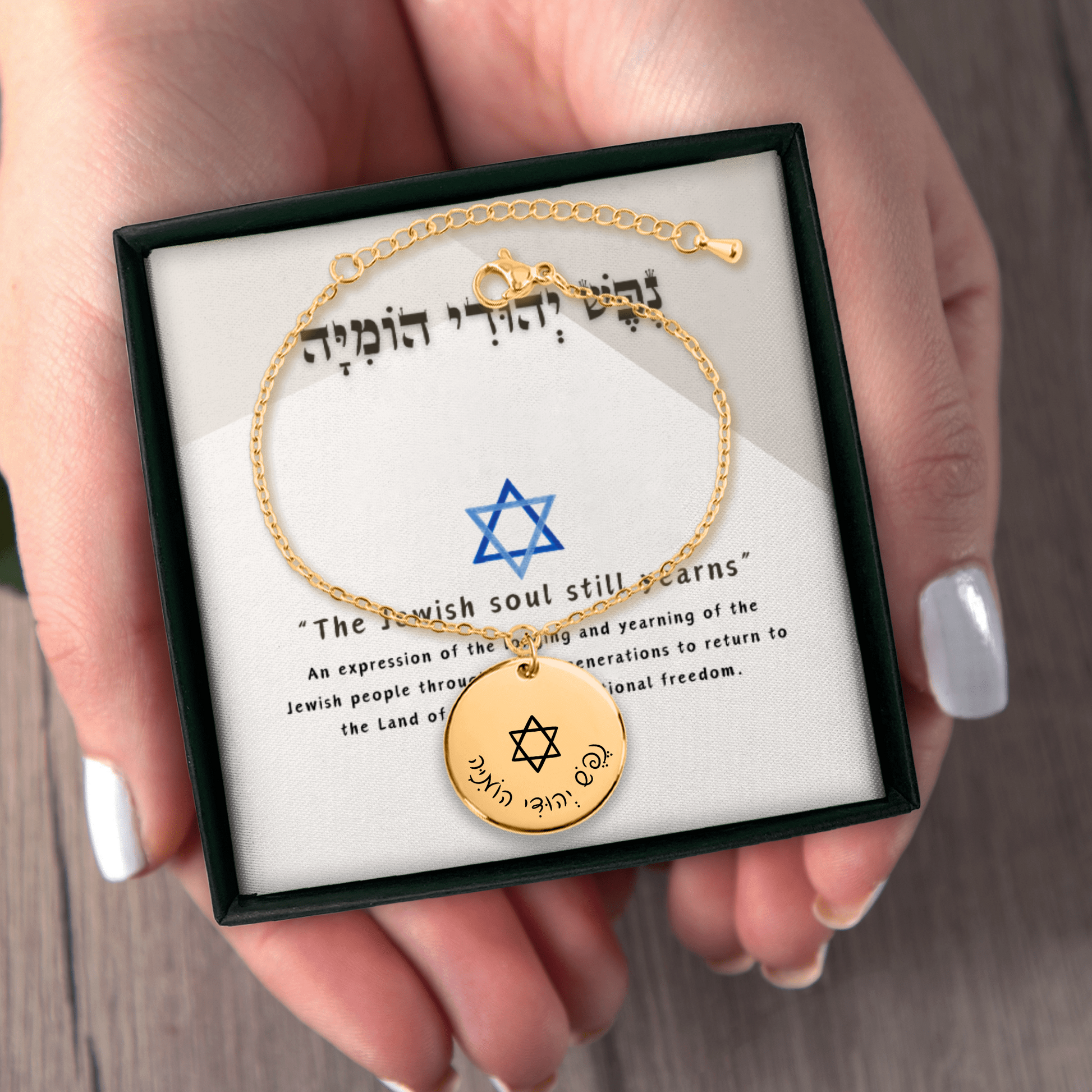 This elegant bracelet features the Hebrew phrase “Nefesh Yehudi Homiyah” (נֶפֶשׁ יְהוּדִי הוֹמִיָּה), which translates as “The Jewish soul still yearns”. Drawn from the opening lines of Hatikvah, the Israeli national anthem, these words express the deep longing and eternal hope of the Jewish people to return to the Land of Israel and live in freedom.