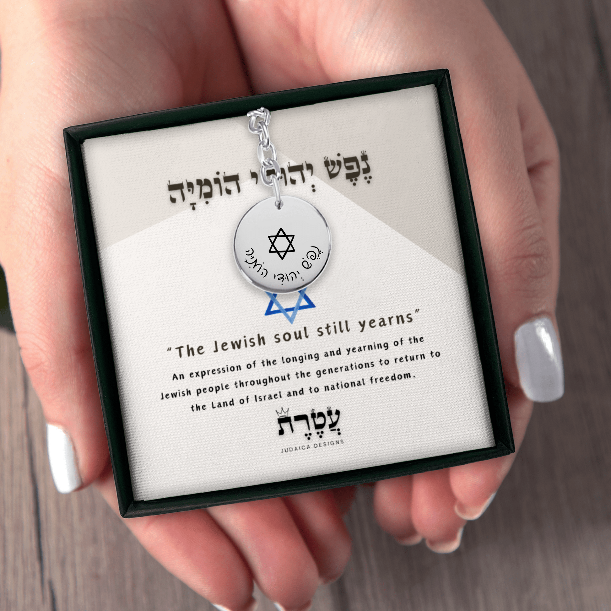 This elegant keychain features the Hebrew phrase “Nefesh Yehudi Homiyah” (נֶפֶשׁ יְהוּדִי הוֹמִיָּה), which translates as “The Jewish soul still yearns”. Drawn from the opening lines of Hatikvah, the Israeli national anthem, these words express the deep longing and eternal hope of the Jewish people to return to the Land of Israel and live in freedom.