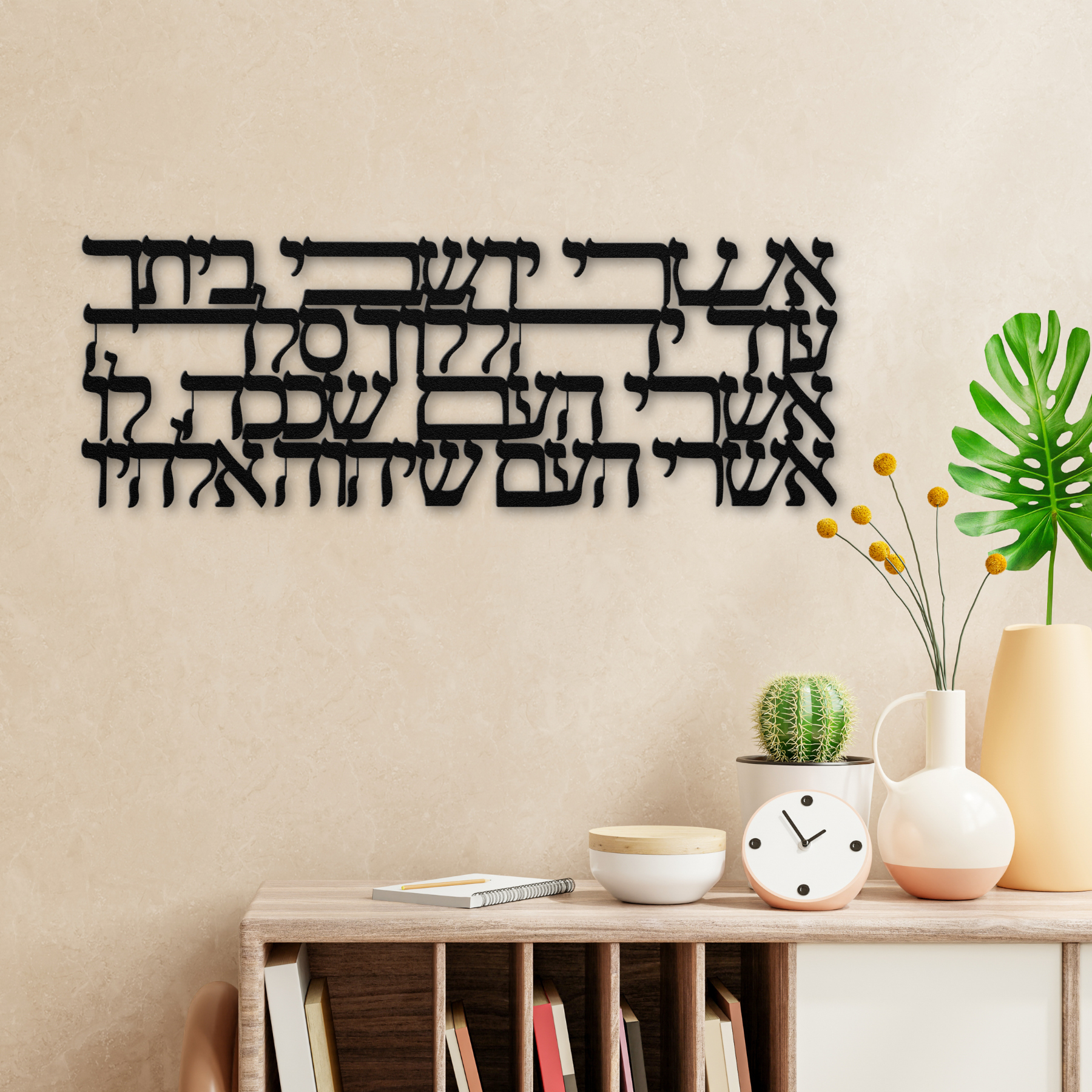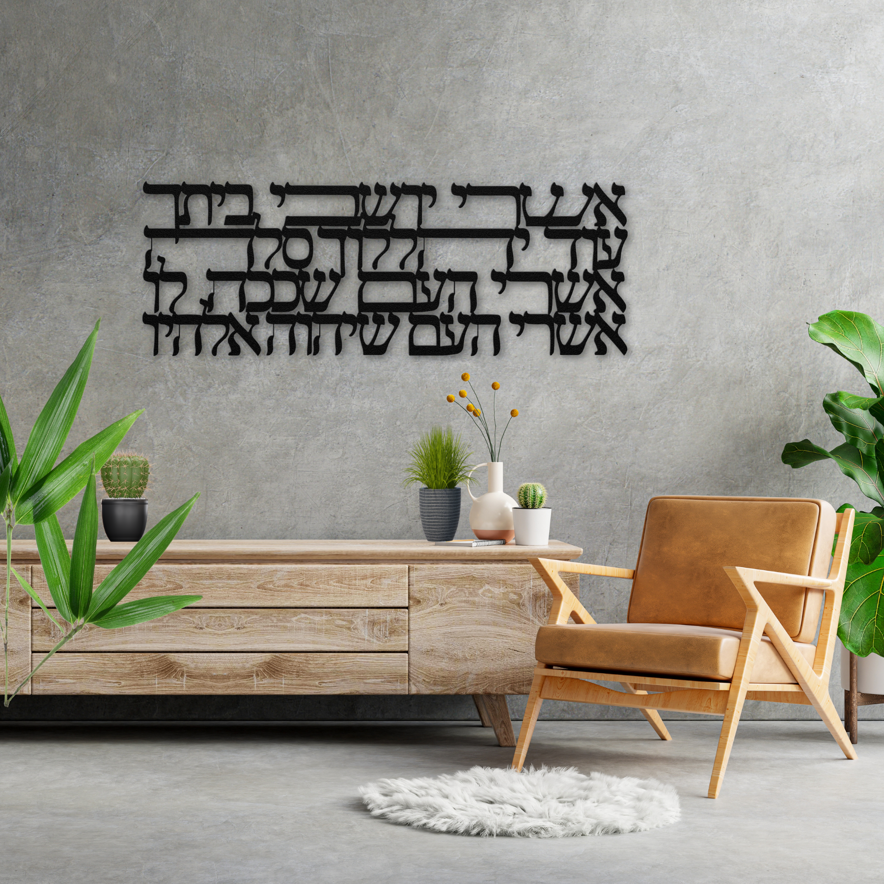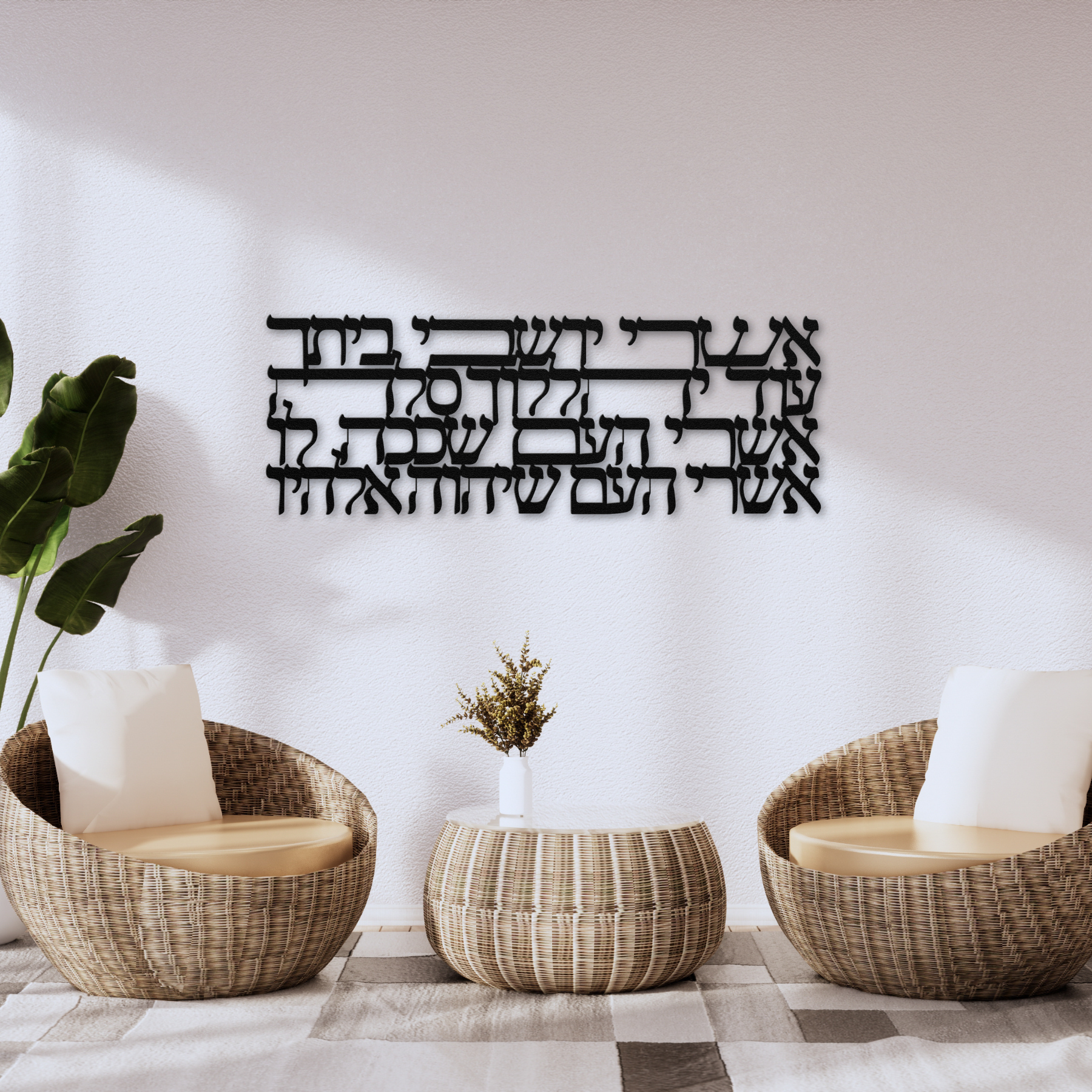 Hebrew metal sign featuring the verses “Ashrei yoshvei veitecha, od yehalelucha selah. Ashrei ha’am shekacha lo, ashrei ha’am she’Adonai Elohav.”
