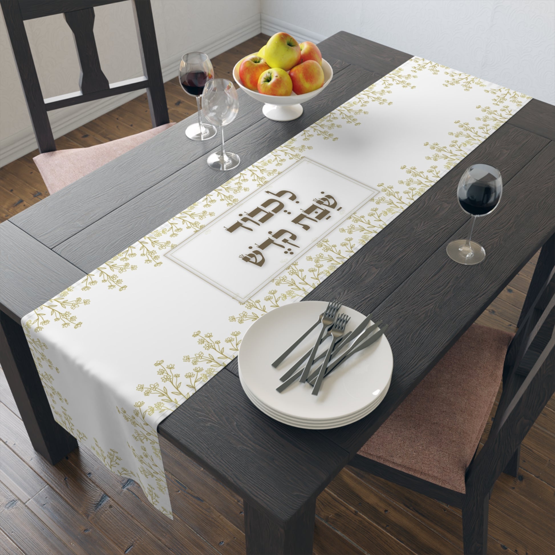 Enhance your Shabbat table with this beautifully designed Shabbat table runner. Made from your choice of high-quality cotton or polyester, this elegant runner features Hebrew inscription 'Lechavod Shabbat Kodesh' (In honor of the holy Shabbat), adding beauty and meaning to your Shabbat dinner. A perfect blend of tradition and modern style, it elevates your table with warmth and charm. Durable and easy to maintain, it’s a must-have for your Shabbat table.